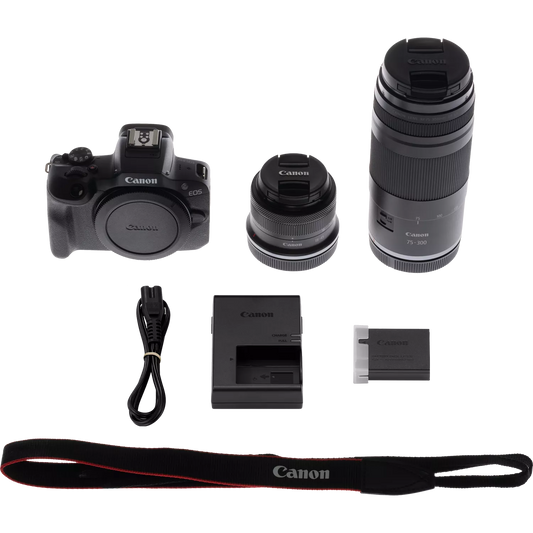 Canon EOS R50 Mirrorless Camera, Black + RF-S 18-45mm F4.5-6.3 IS STM Lens + RF 75-300mm F4-5.6 Lens
