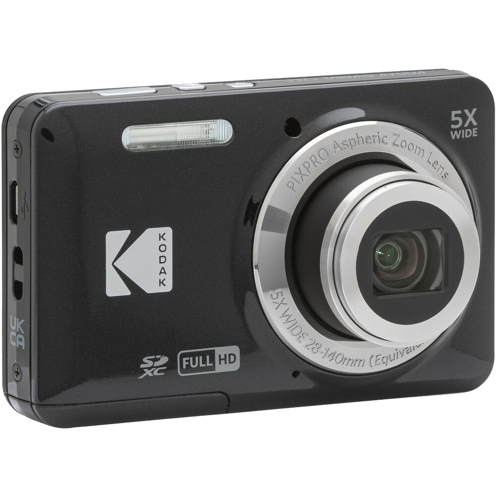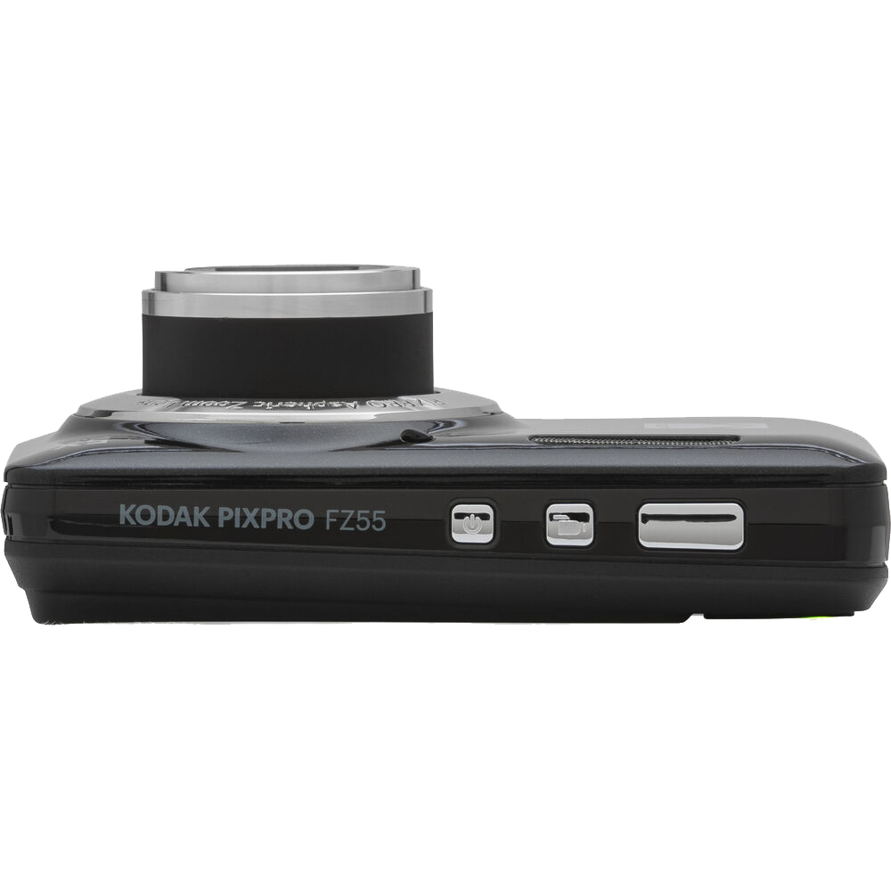 The Kodak PIXPRO FZ55 Digital Camera in black is a small and easy-to-use Friendly Zoom camera from the Kodak PIXPRO collection. This point-and-shoot camera features a 28mm wide-angle lens with a 16MP 1/2.3" CMOS sensor and 2.7" LCD screen. The PIXPRO FZ55 has multiple flash and shooting modes along with a variety of detection features, including face and smile detection. The PIXPRO FZ55 is powered by a rechargeable lithium-ion battery that can be charged inside the camera.
