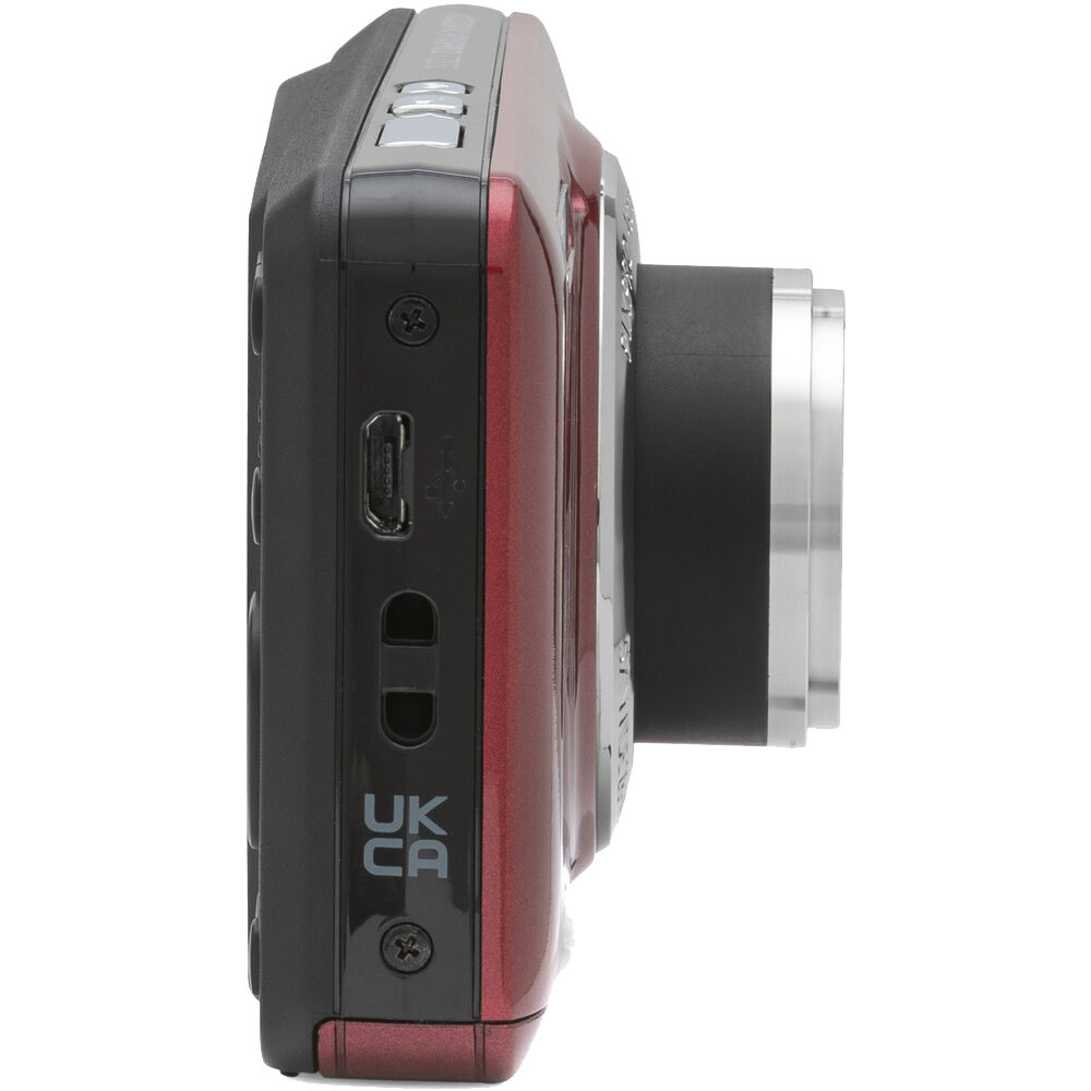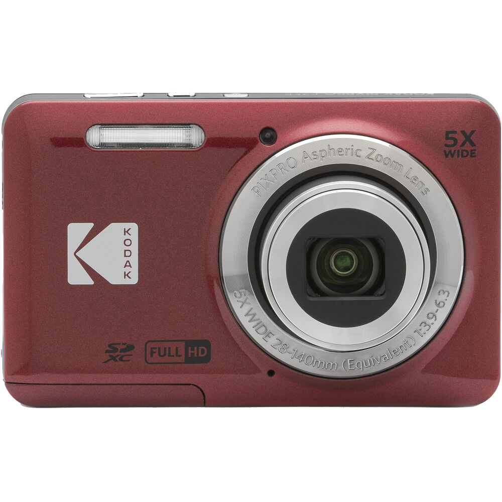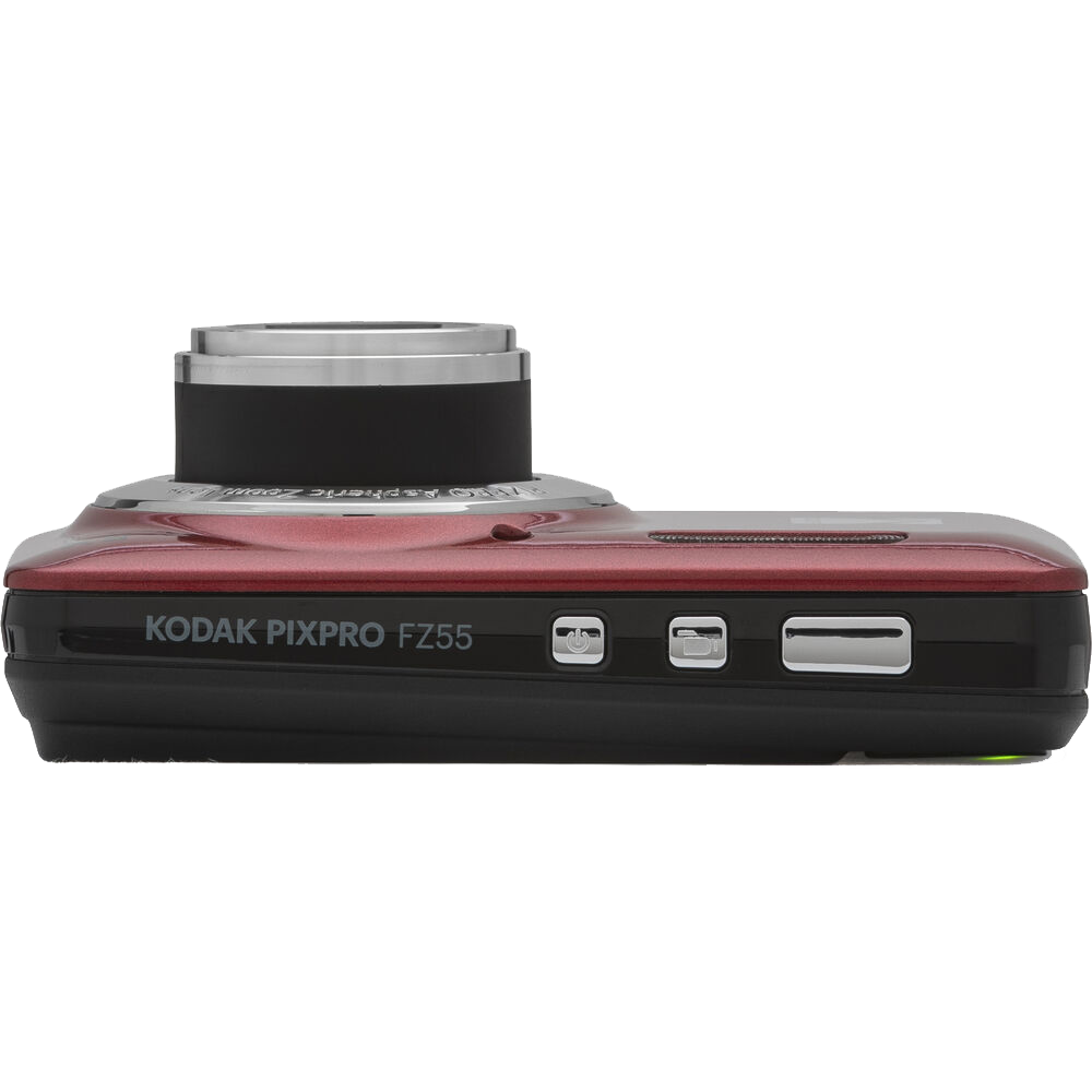 The Kodak PIXPRO FZ55 Digital Camera in red is a small and easy-to-use Friendly Zoom camera from the Kodak PIXPRO collection. This point-and-shoot camera features a 28mm wide-angle lens with a 16MP 1/2.3" CMOS sensor and 2.7" LCD screen. The PIXPRO FZ55 has multiple flash and shooting modes along with a variety of detection features, including face and smile detection. The PIXPRO FZ55 is powered by a rechargeable lithium-ion battery that can be charged inside the camera.