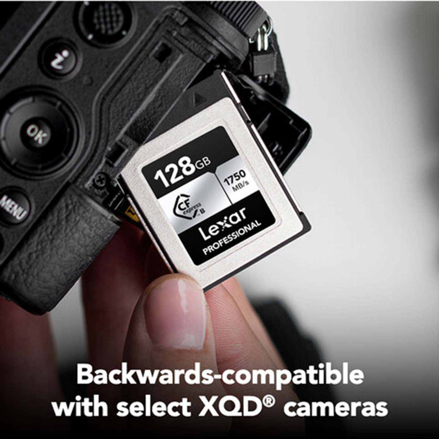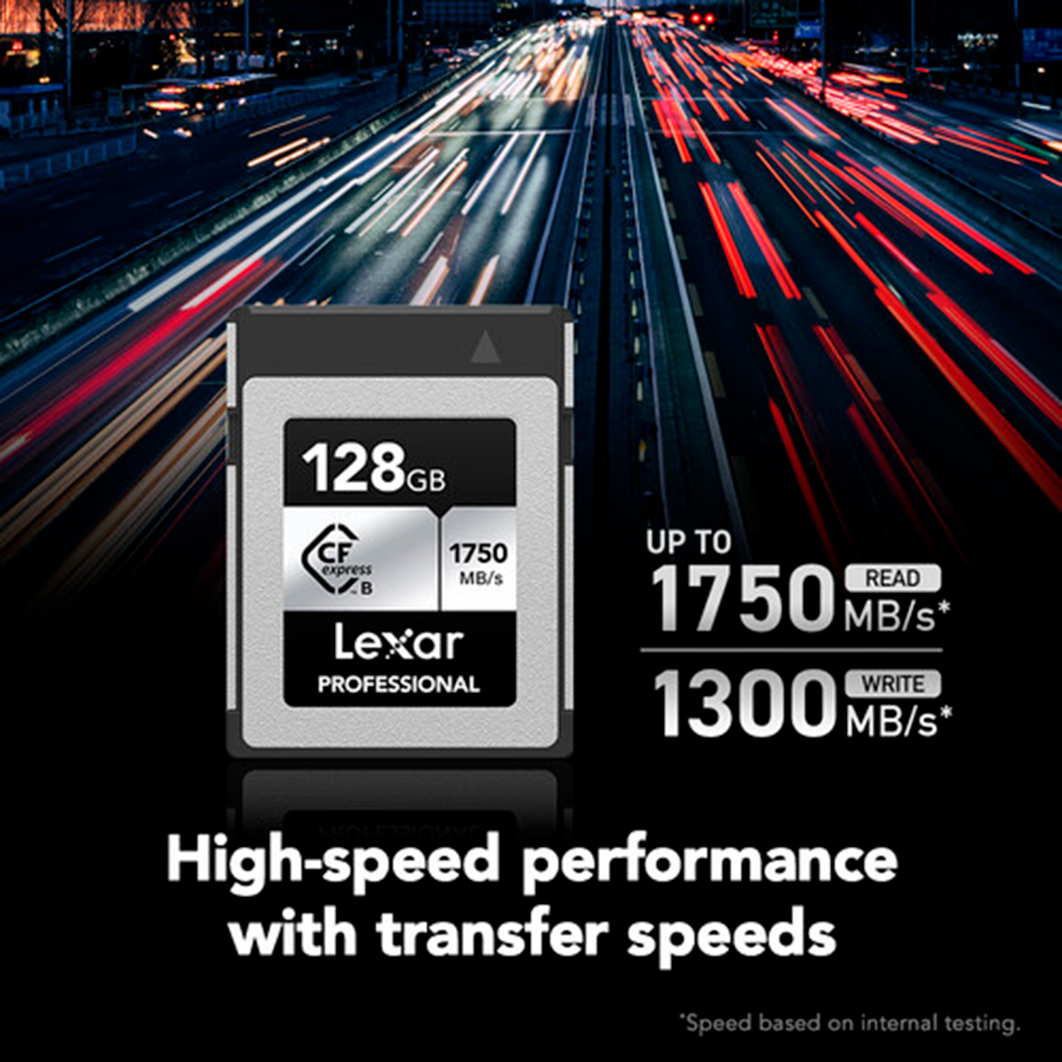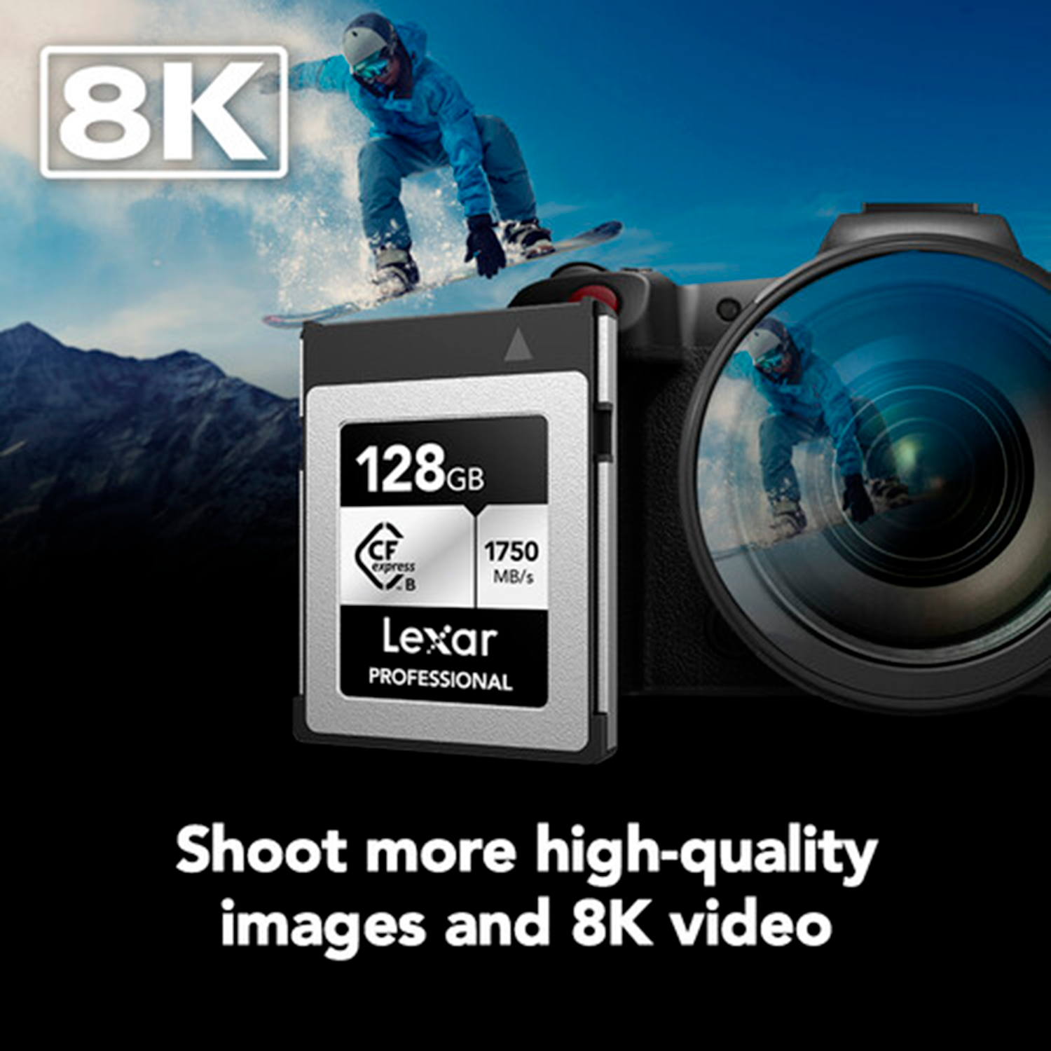 Leverage the capabilities of next-level cinema cameras and high-resolution DSLRs with the 128GB Professional CFexpress Type B Card SILVER Series from Lexar, which smoothly captures 8K video and high-quality images with ease. This card utilizes the PCIe 3.0 x2 bus to provide high-speed performance, with read speeds up to 1750 MB/s,