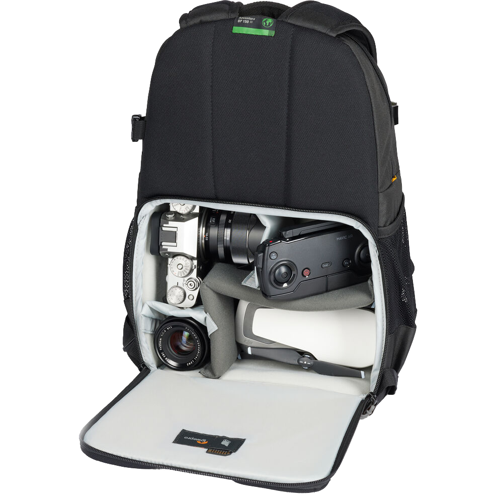 The brand-new Adventura III is always ready for wherever your next adventure takes you, delivering protection in a compact package. This camera backpack is perfectly designed to fit your crop-sensor mirrorless cameras, such as the Fujifilm XT200, the Canon M50 MII, the EOS R10 or the Nikon Z50, with lenses attached as well as 2 to 3 small lenses or a charger and battery. Or a foldable drone, such as the Mavic Air. Never leave anything you need for a great shot, as this backpack also has room for a 10'''' tablet, the Gorillapod 3K or Befree Advanced and any extras you may need, including but not limited to jackets, snacks, sunglasses and water bottles.