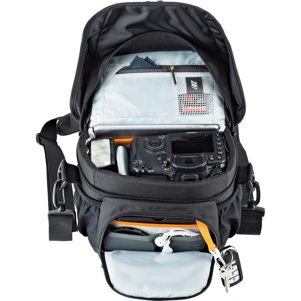Sling this black Nova 160 AW II Camera Bag from Lowepro over your shoulder, and you're ready to head out to make great images. There's plenty of room for your DSLR with 17-85mm attached lens, one or two additional lenses, a flash, and related accessories, and the bag is built to withstand the weather.