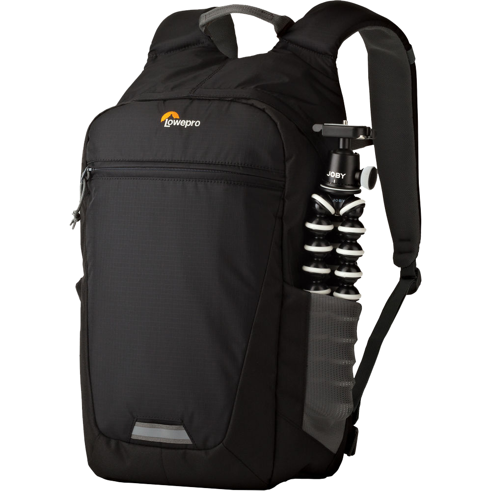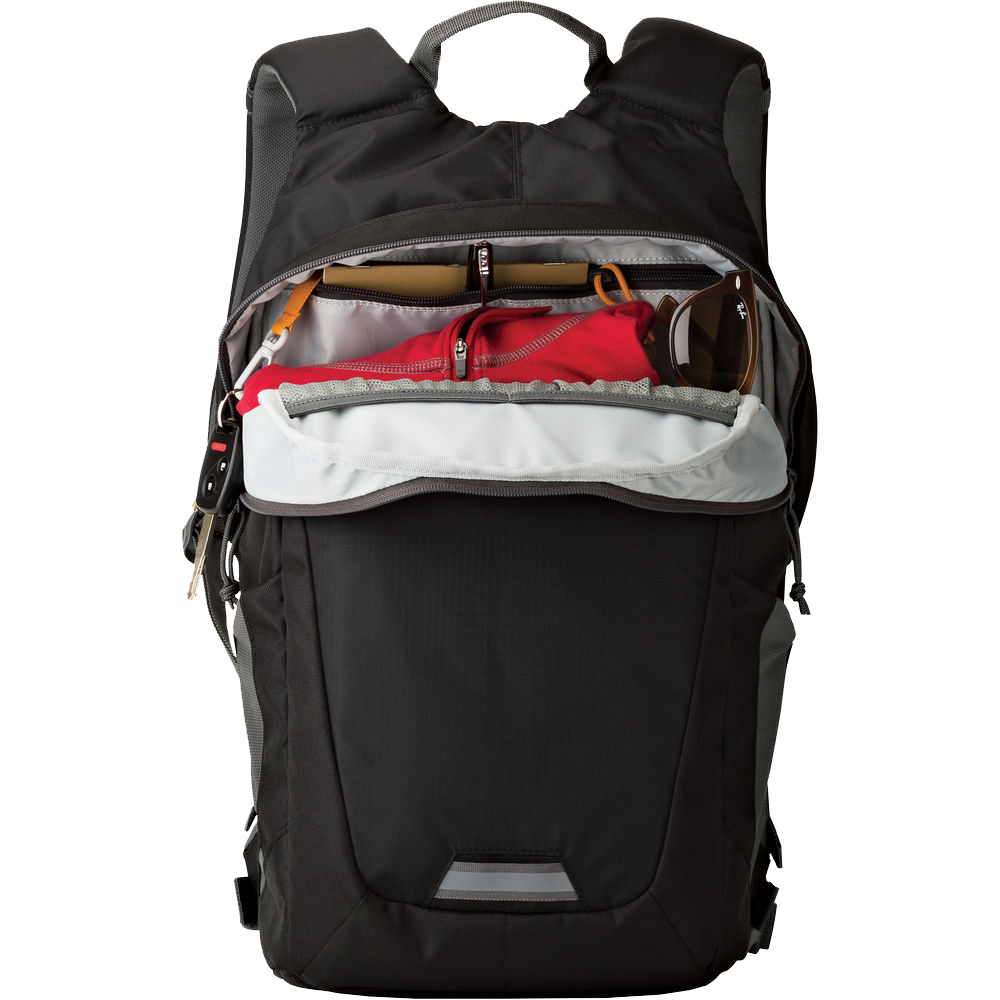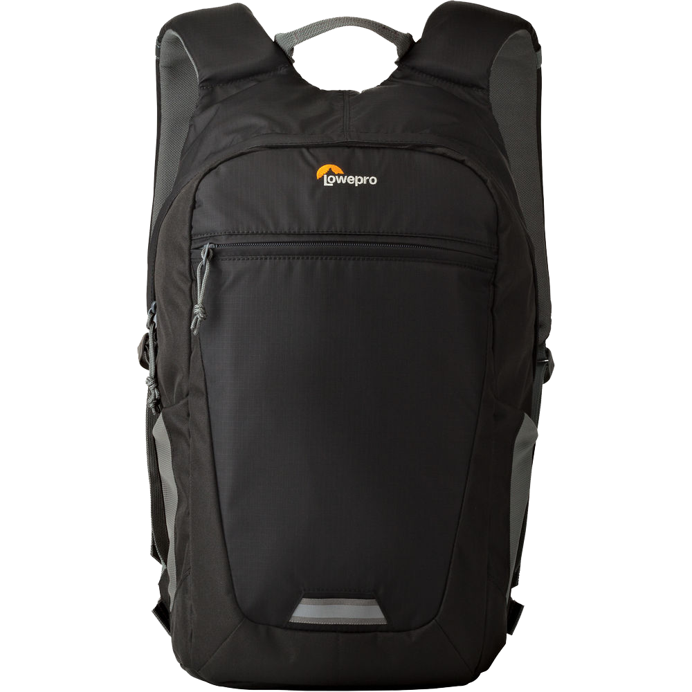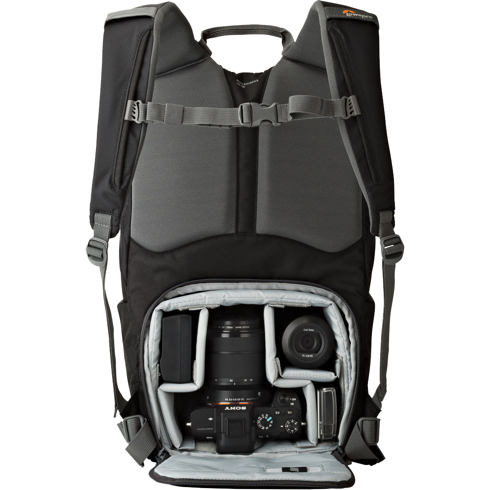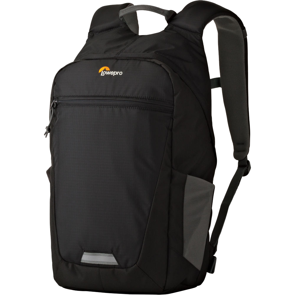 Sleek and capable, the black/gray Photo Hatchback Series BP 150 AW II Backpack from Lowepro is designed to hold a DSLR with attached lens, an extra lens, related accessories, and personal gear. On the front of the pack is a zippered storage area for personal items, accessory pockets, key fob, and a CradleFit pocket for your tablet.