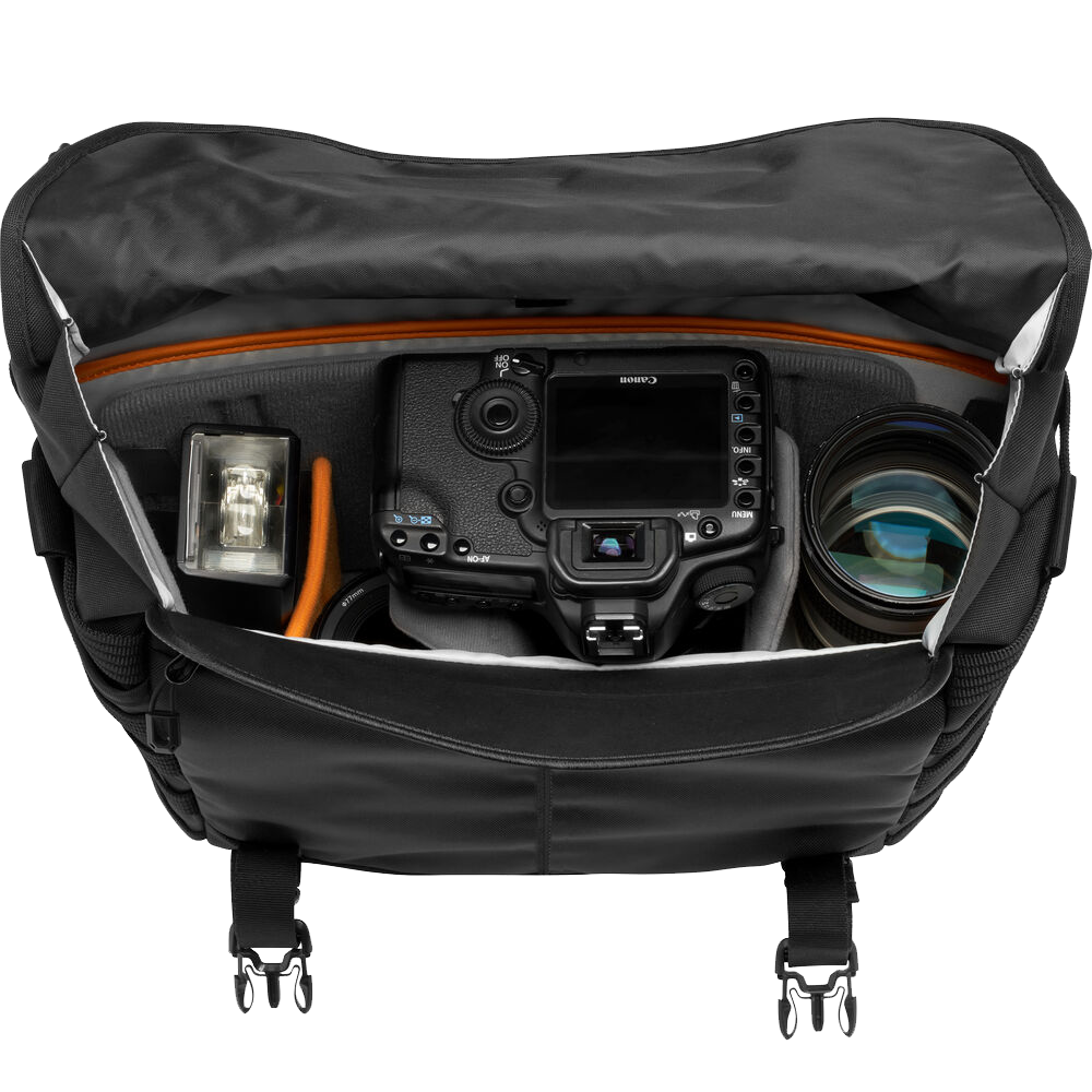 Offering you versatile storage space for your gear, the black ProTactic MG 160 AW II Camera Messenger Bag from Lowepro can carry everything from photo & video gear to binoculars or even a small drone.